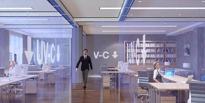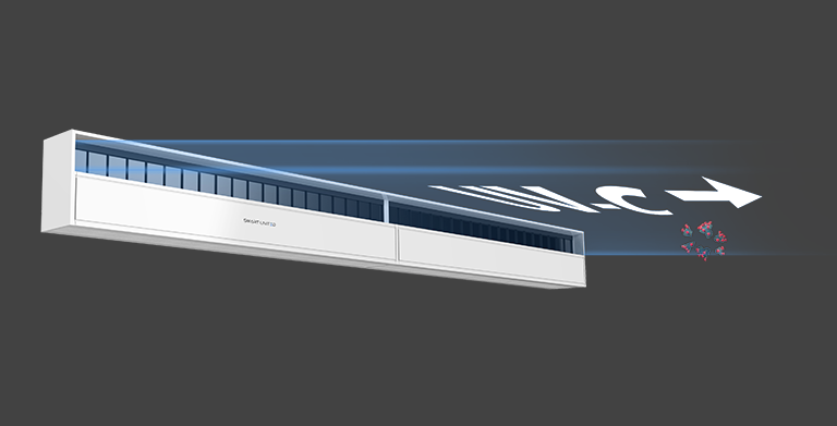 Mit der UV Smart Ceiling wird eine deckenüberspannende Lichtwand erzeugt, die durch Raumtemperatur oder Klimaanlagen aufsteigende Viren mittels UV-C Licht zuverlässig deaktiviert.